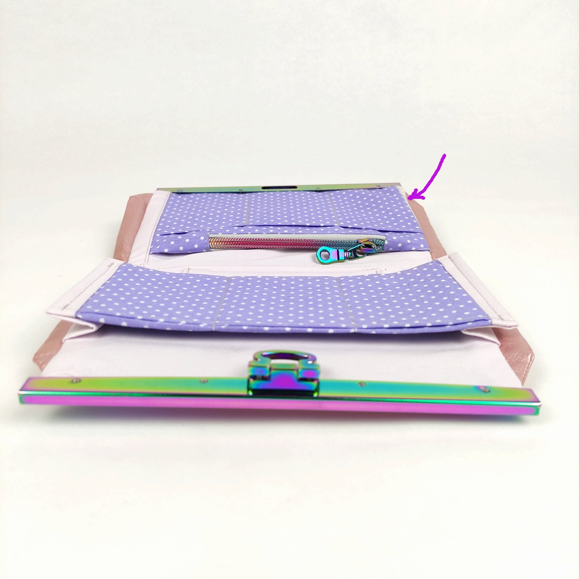 Πορτοφόλι με ροζ μεταλλιζέ δερματίνη και Rainbow μεταλλικό πλαίσιο. Έχει μια εξωτερική τσέπη με μαγνητικό κούμπωμα, θεση για χαρτονομίσματα, τσέπη με φερμουάρ για κέρματα, θέση για το κινητό (μεγάλη) και 6 θήκες για κάρτες.