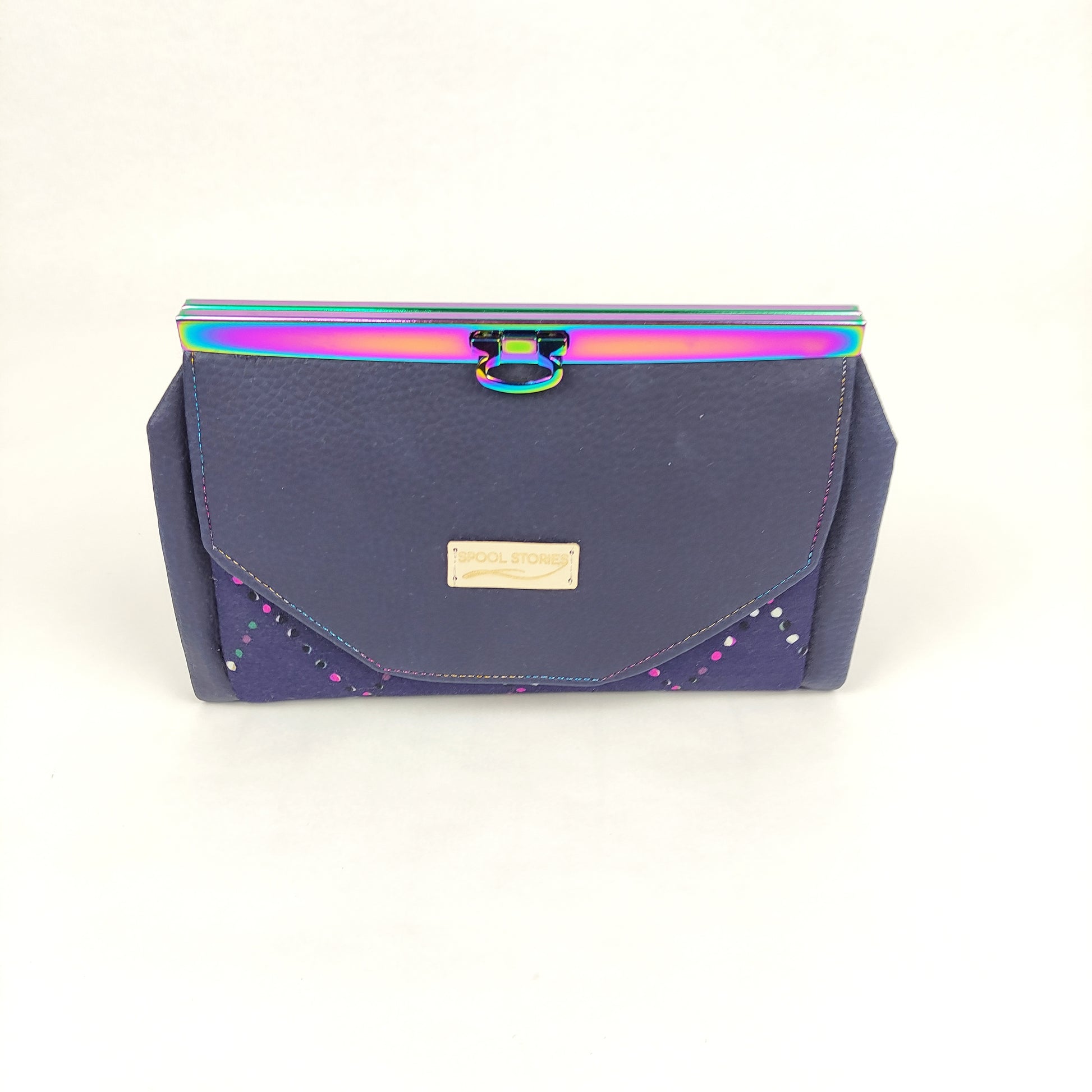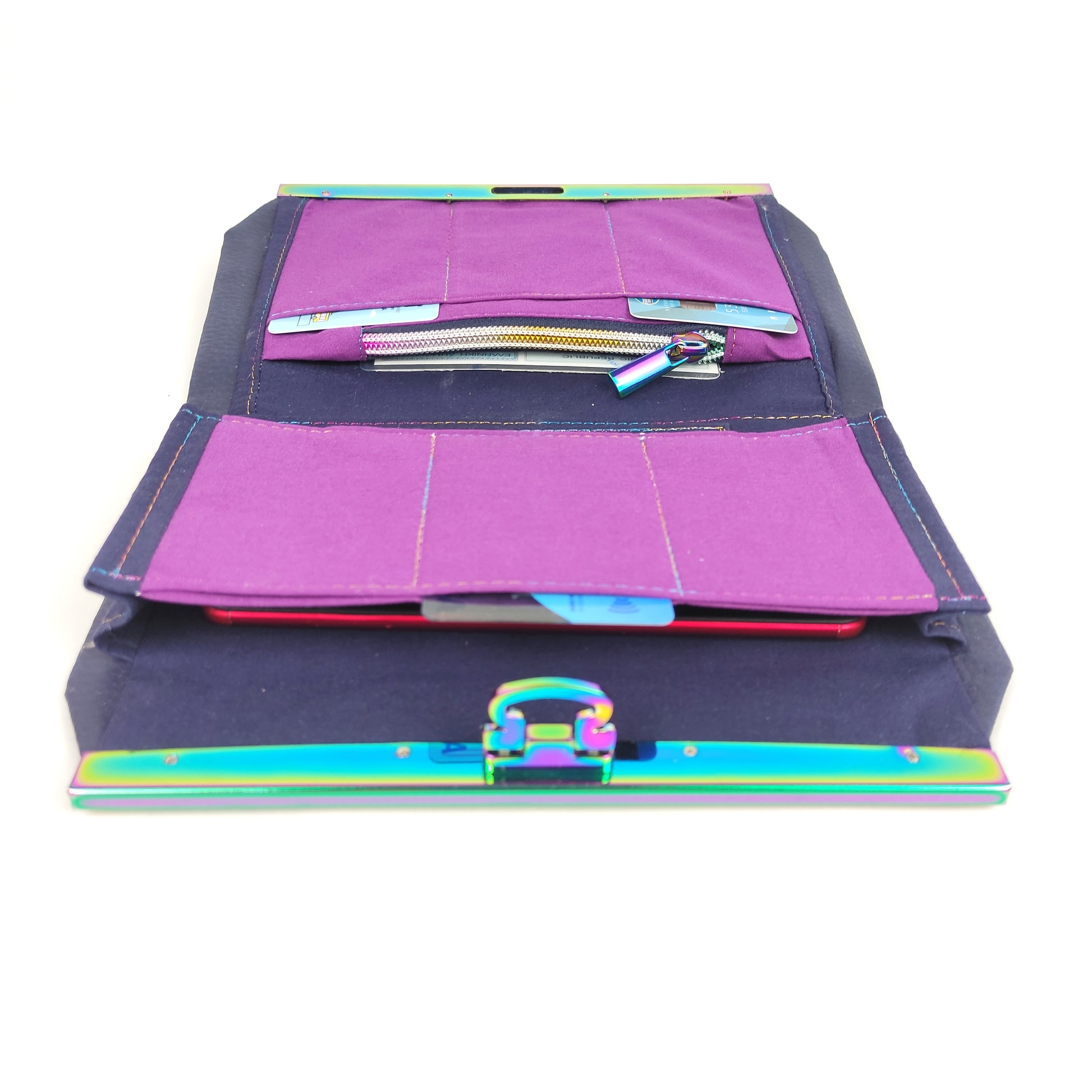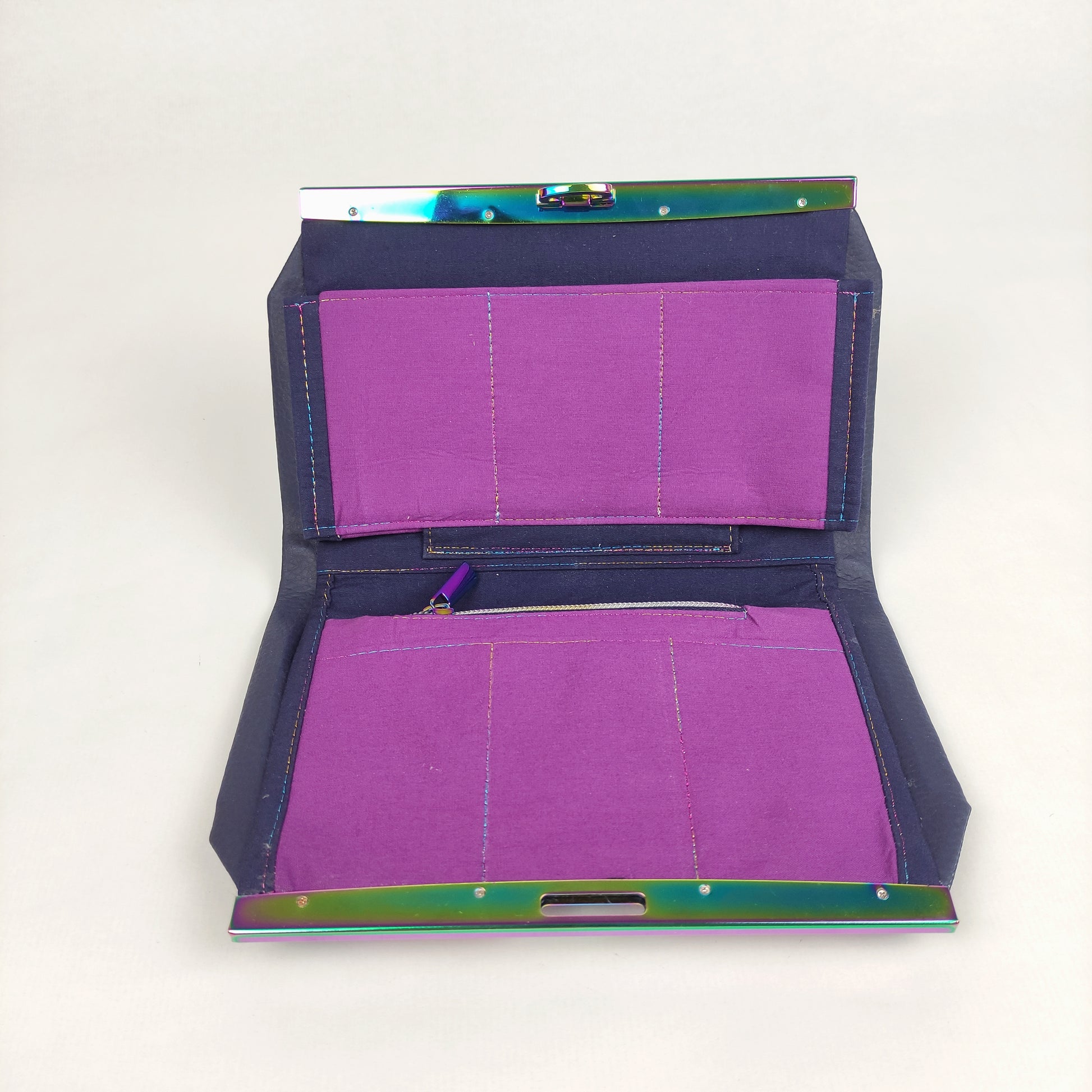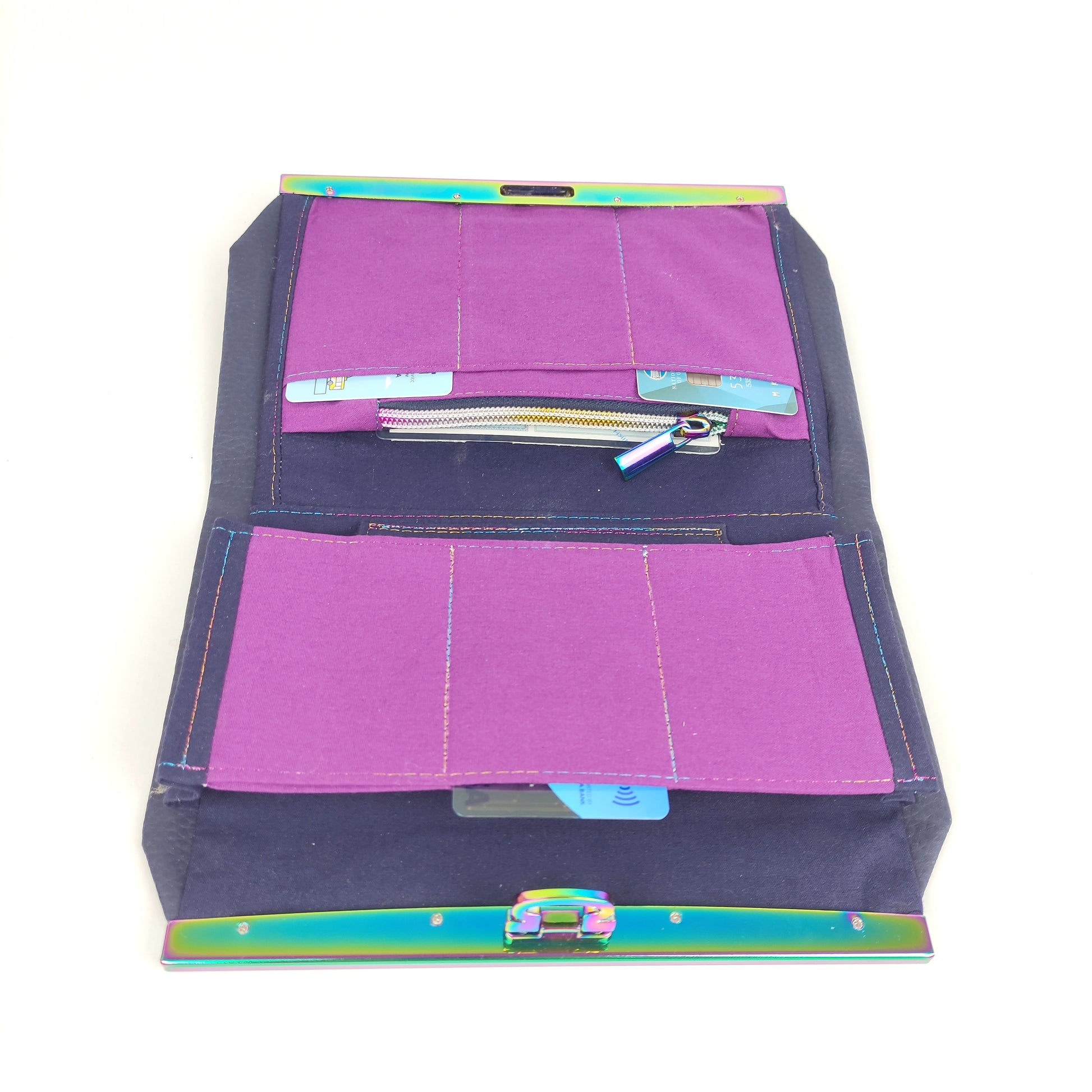 Πορτοφόλι με μπλέ δερματίνη και Rainbow μεταλλικό πλαίσιο. Έχει μια εξωτερική τσέπη με μαγνητικό κούμπωμα, θεση για χαρτονομίσματα, τσέπη με φερμουάρ για κέρματα, θέση για το κινητό (μεγάλη) και 6 θήκες για κάρτες.