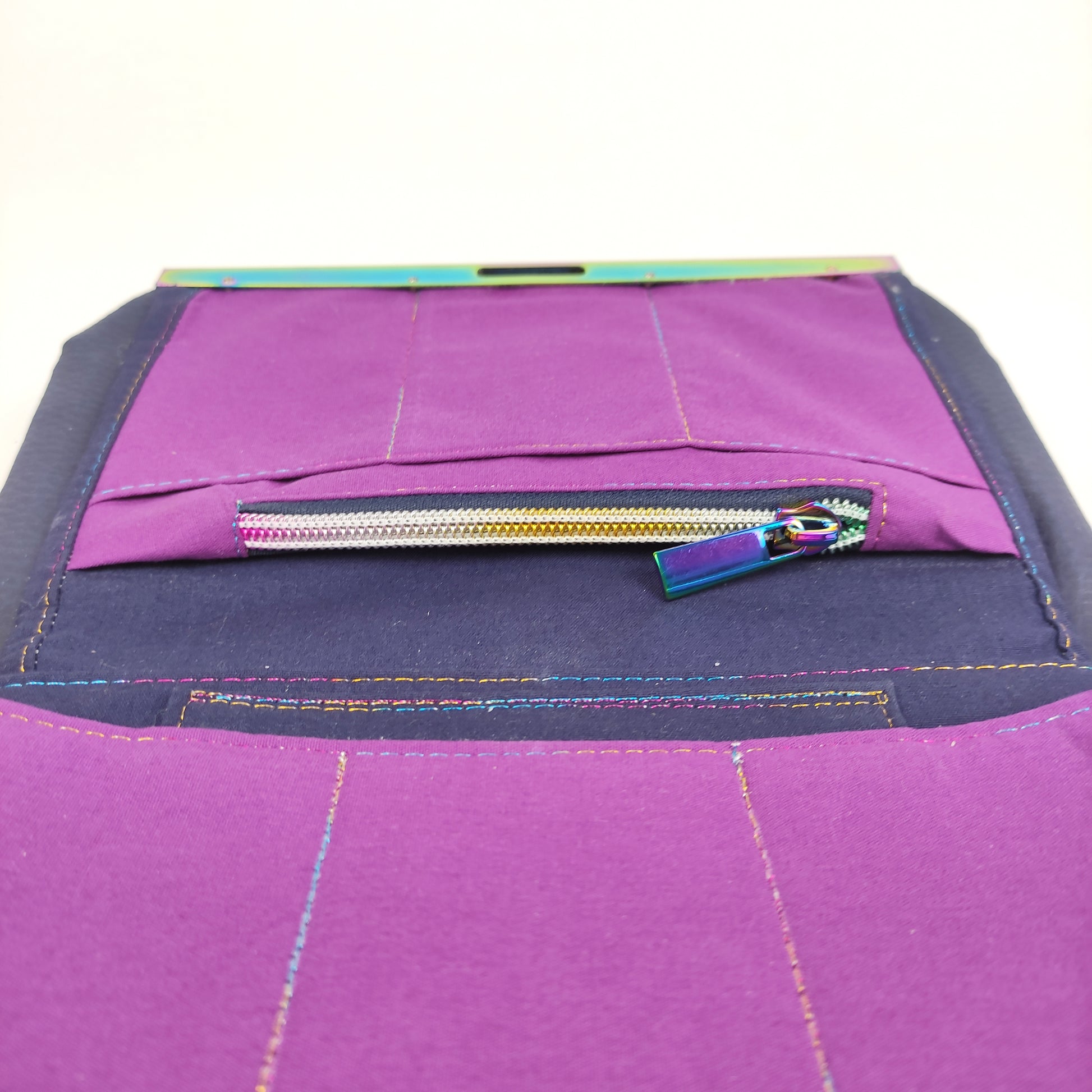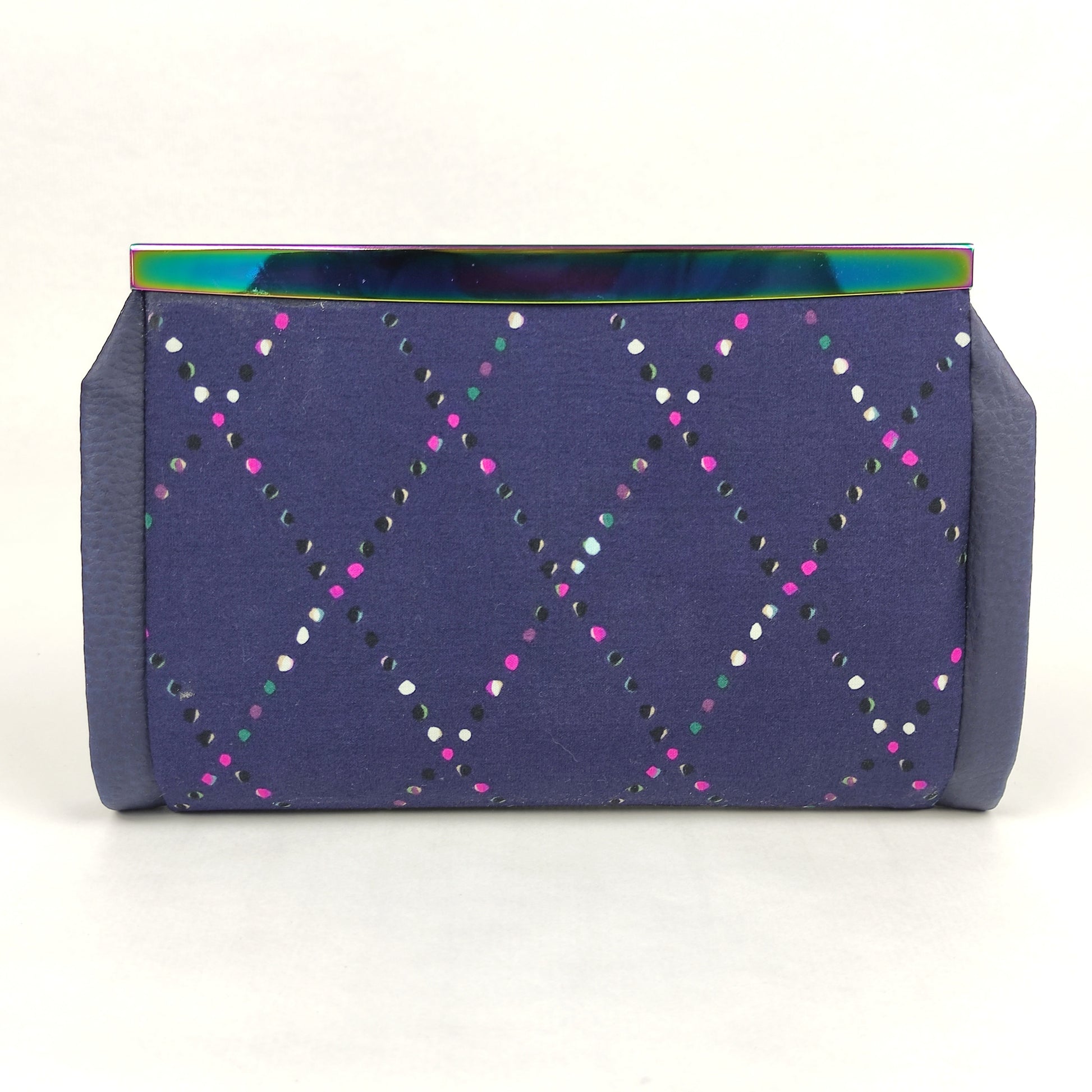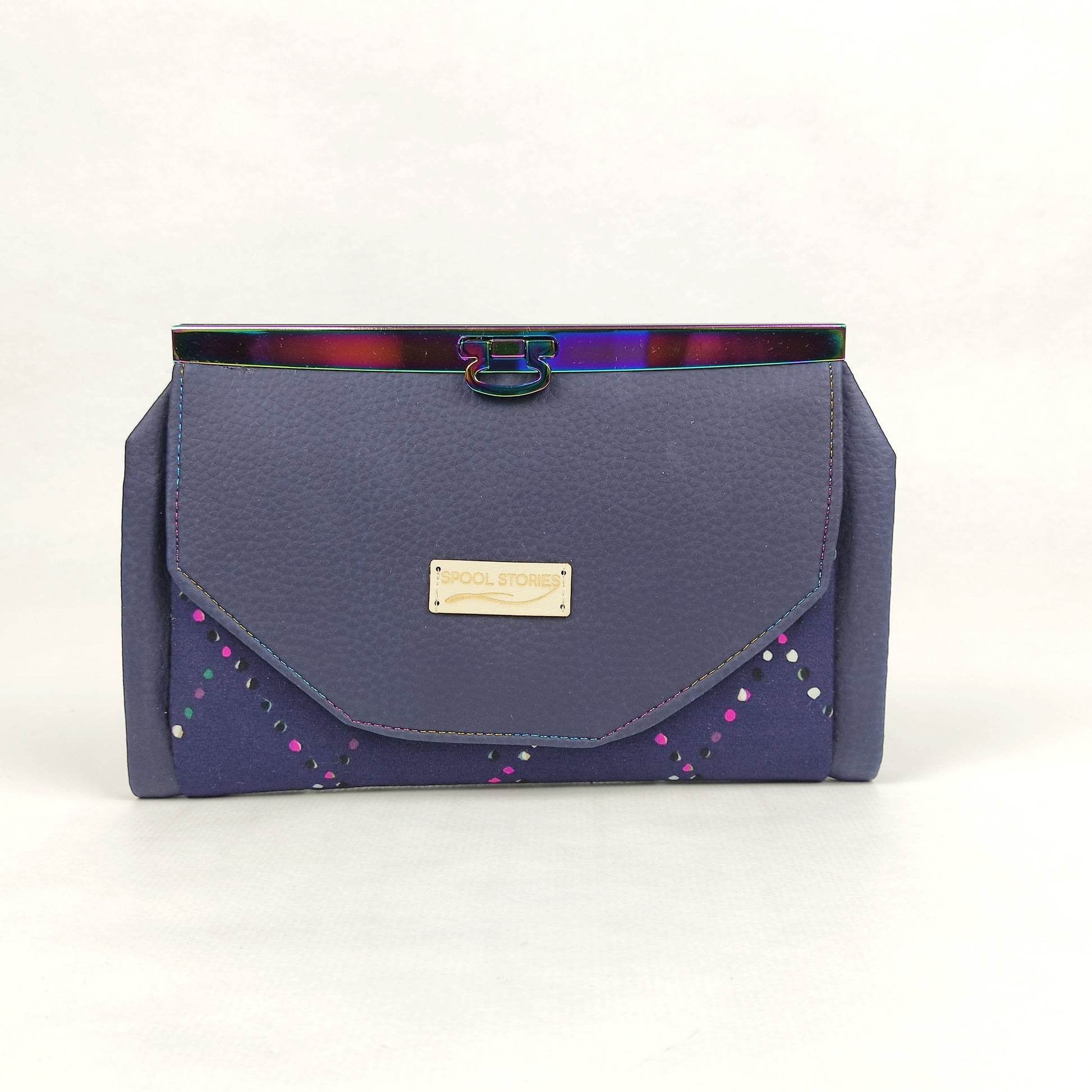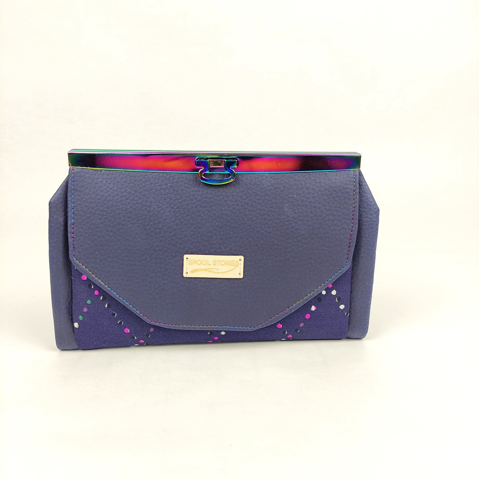 Πορτοφόλι με μπλέ δερματίνη και Rainbow μεταλλικό πλαίσιο. Έχει μια εξωτερική τσέπη με μαγνητικό κούμπωμα, θεση για χαρτονομίσματα, τσέπη με φερμουάρ για κέρματα, θέση για το κινητό (μεγάλη) και 6 θήκες για κάρτες.