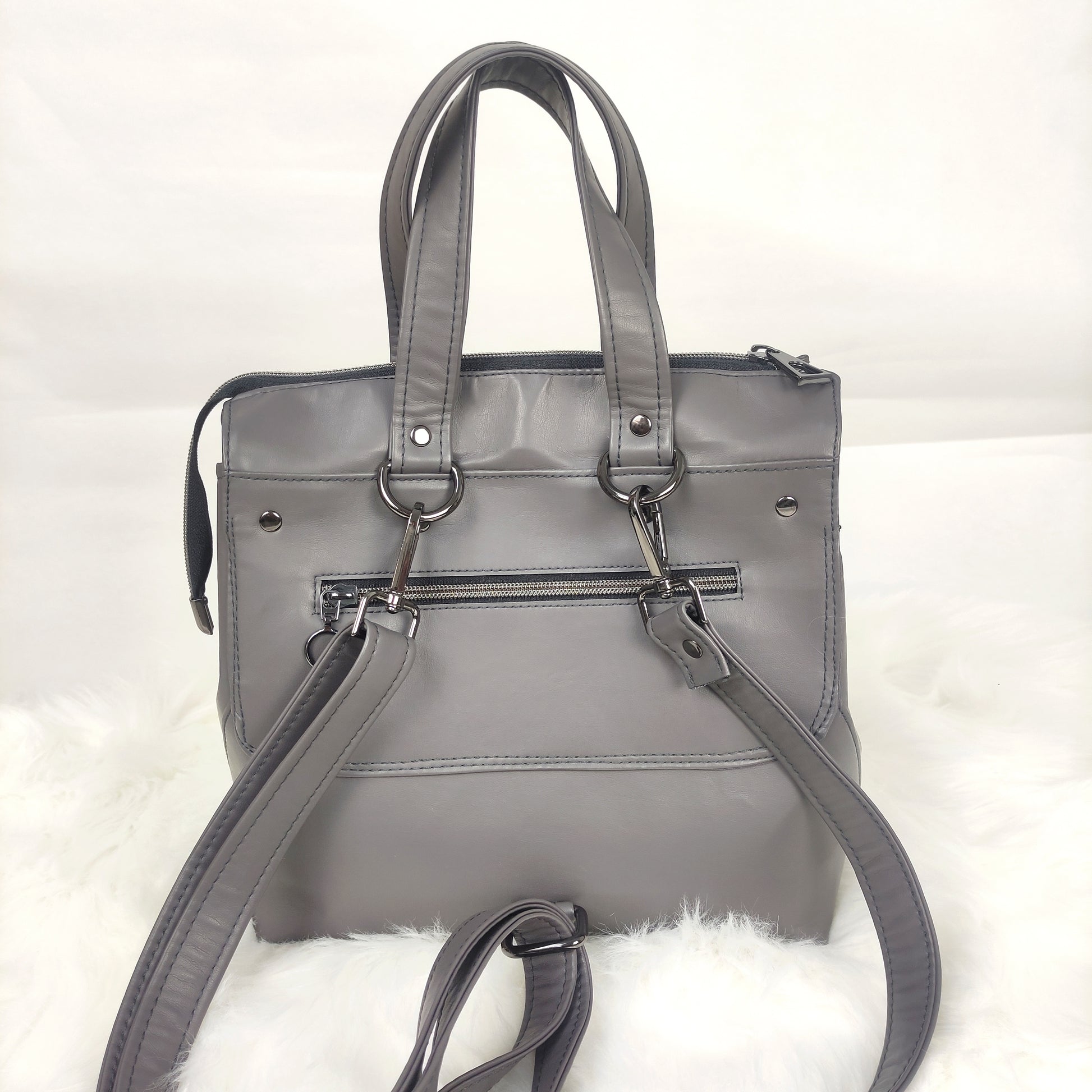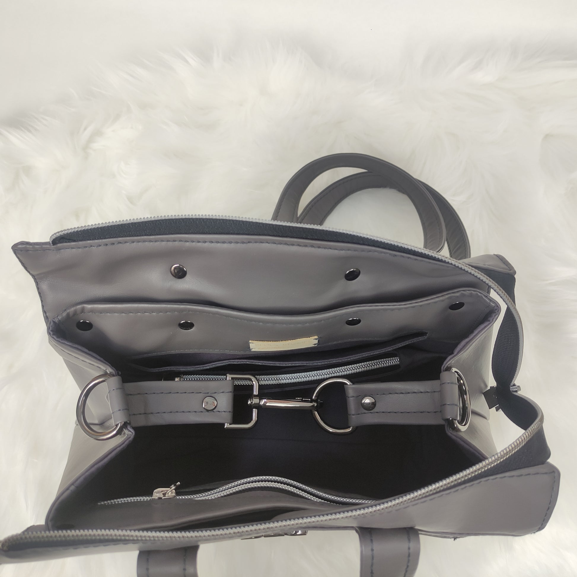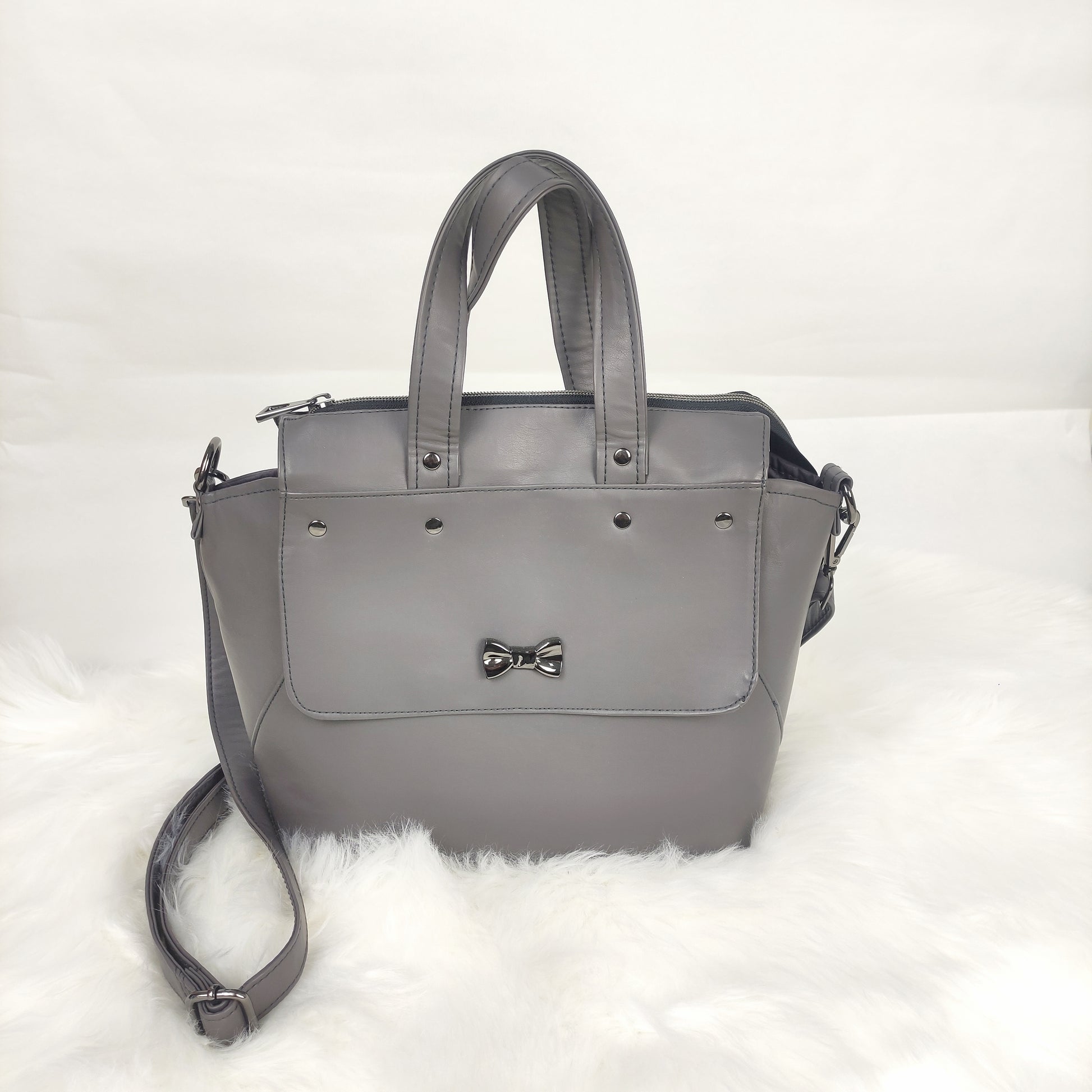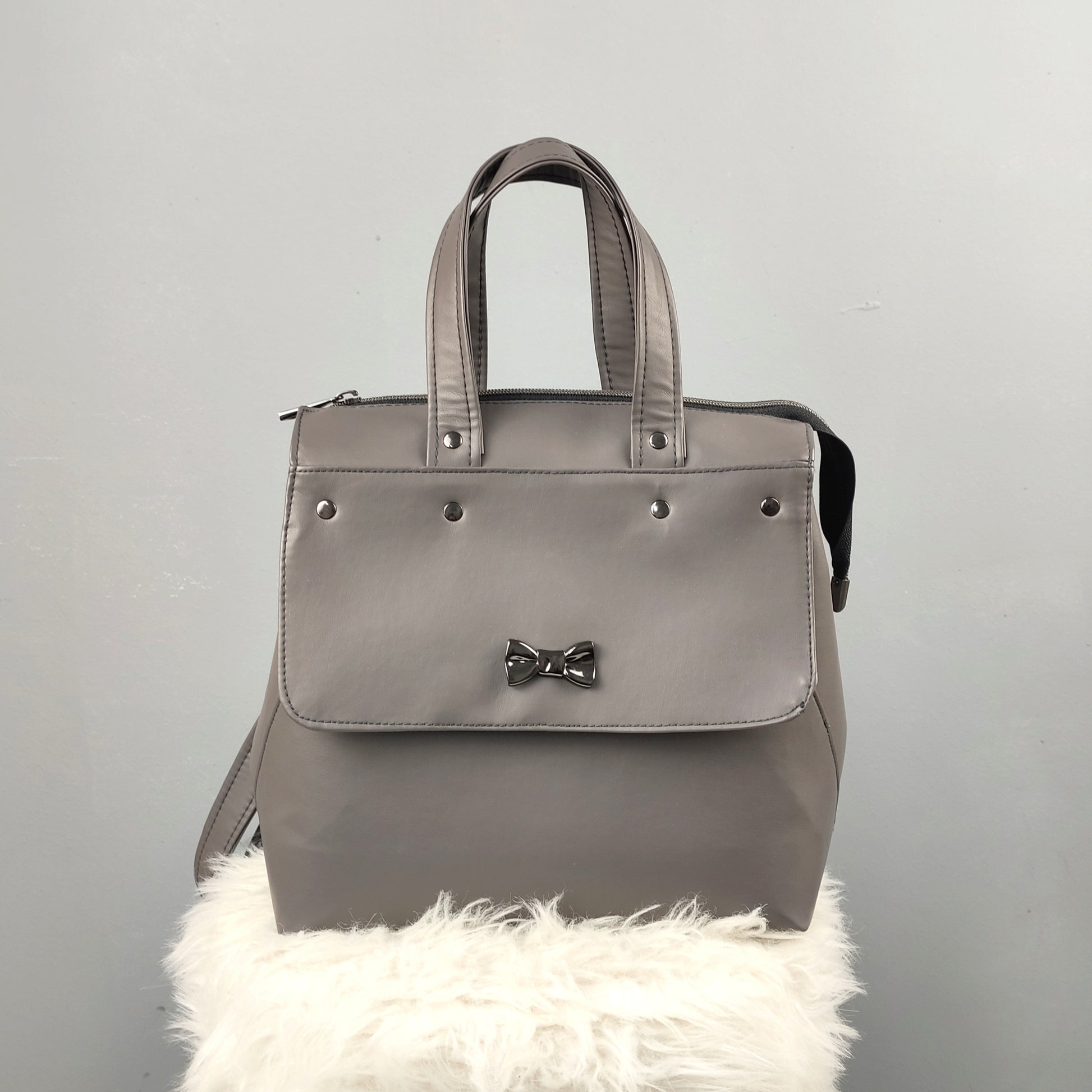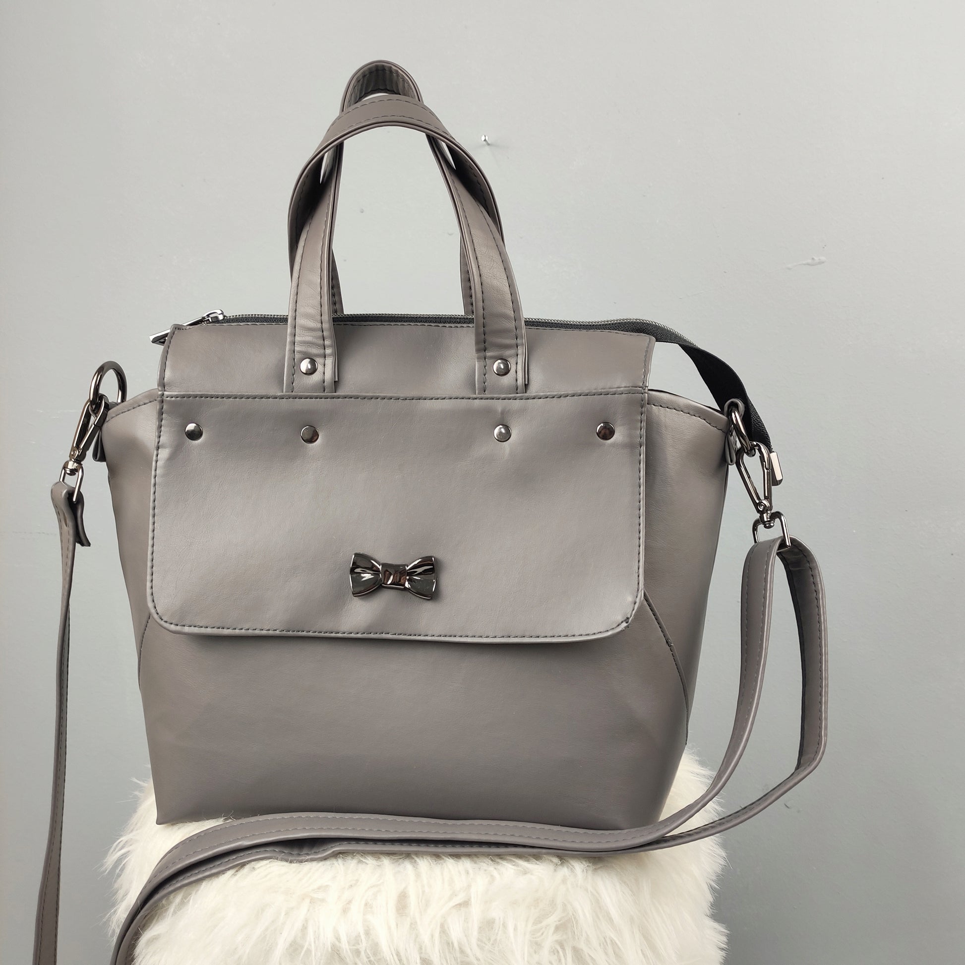 H Solasta είναι μια υπέροχη, ευρύχωρη τσάντα από δερματίνη σε γκρί χρώμα με μαύρο νίκελ μεταλλικά στοιχεία.